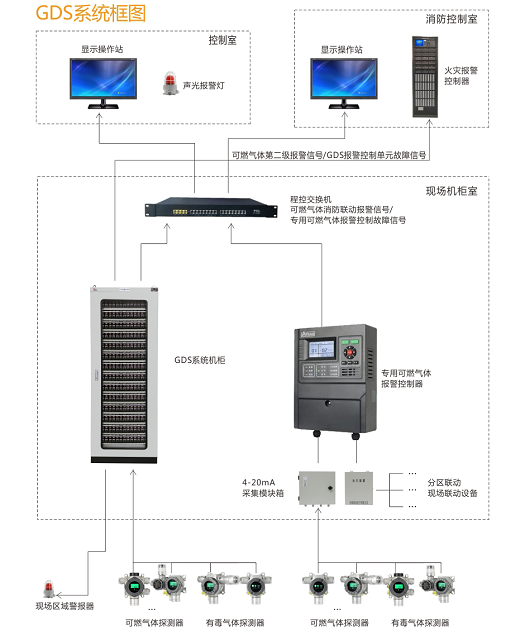 GDS系統(可燃/有毒氣體檢測報警系統)是自主研發的可編程控制系統,系統完全符合GB/T50493-2019相關要求,是一款功能實用、操作方便的可燃氣體報警控制器,可與我公司氣體探測器配套組成工業用可燃氣體報警系統。系統由氣體檢測報警儀器、機柜式氣體控制單元、數據采集模塊和工作站組成。